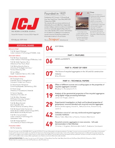or stored in any media for mass circulation without the prior written consent of the publisher. The information and views expressed in articles published in The Indian Concrete Journal (ICJ) are those of the